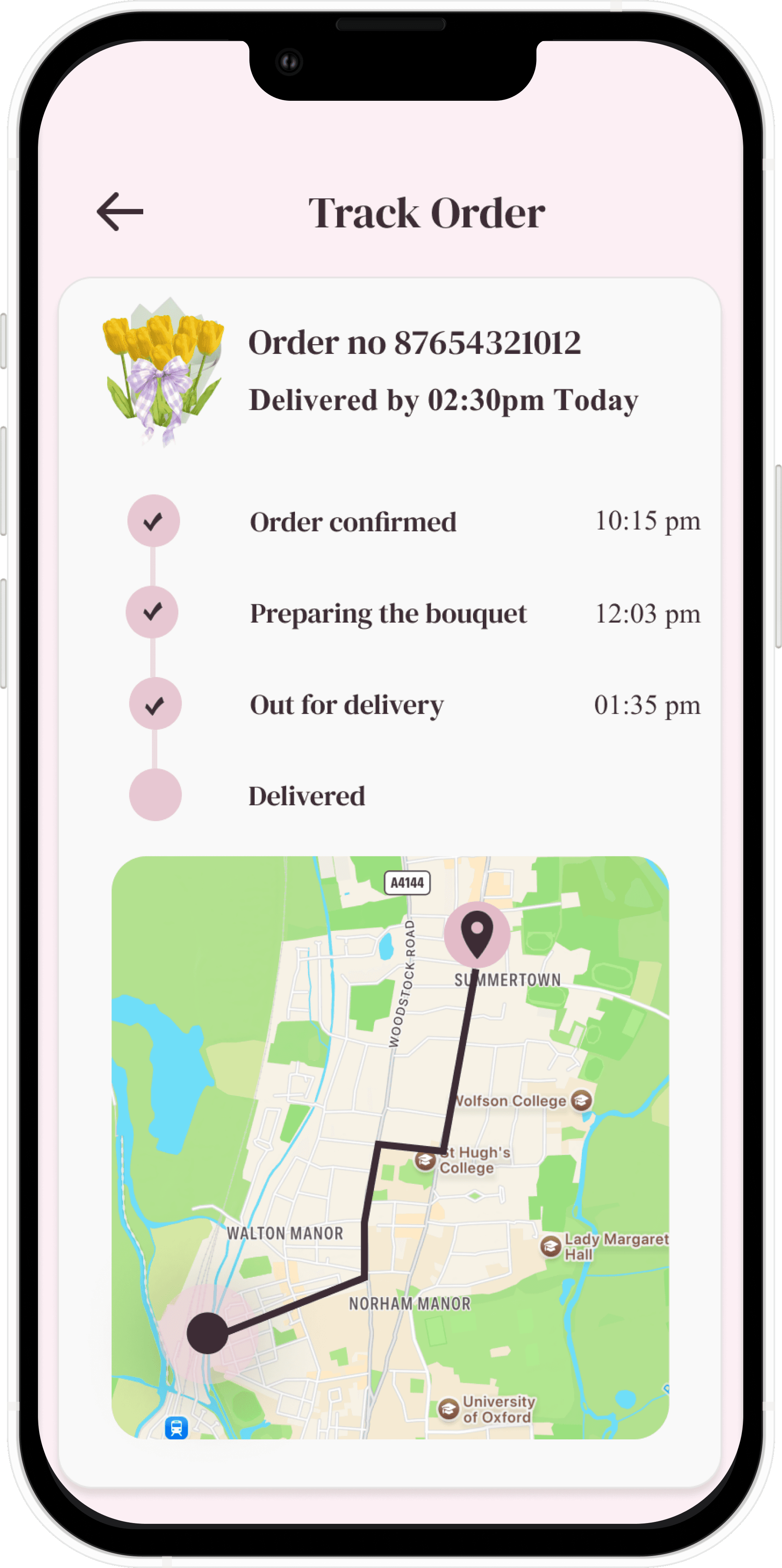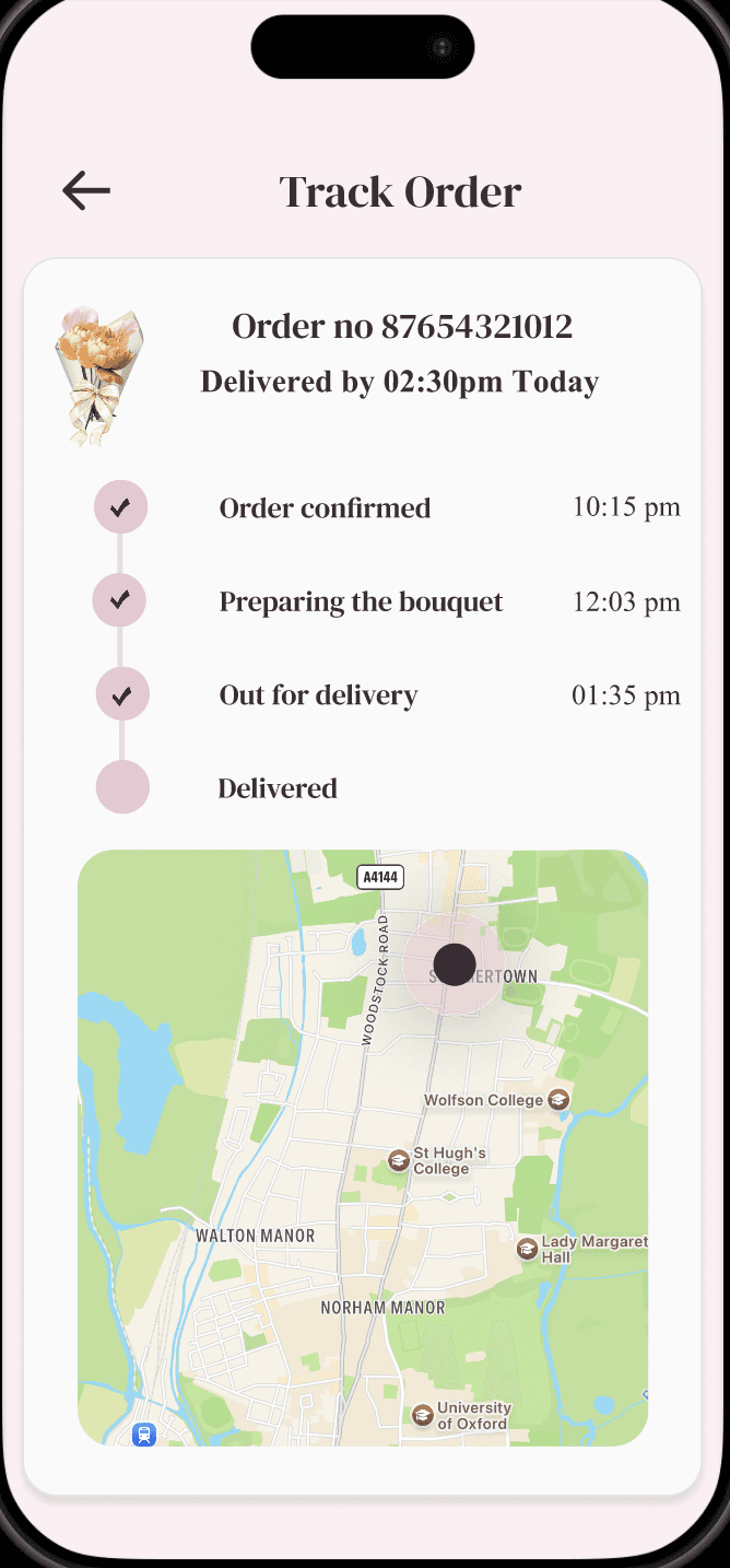 Adding subtle animations — such as flowers blooming during customization or a progress indicator during tracking —